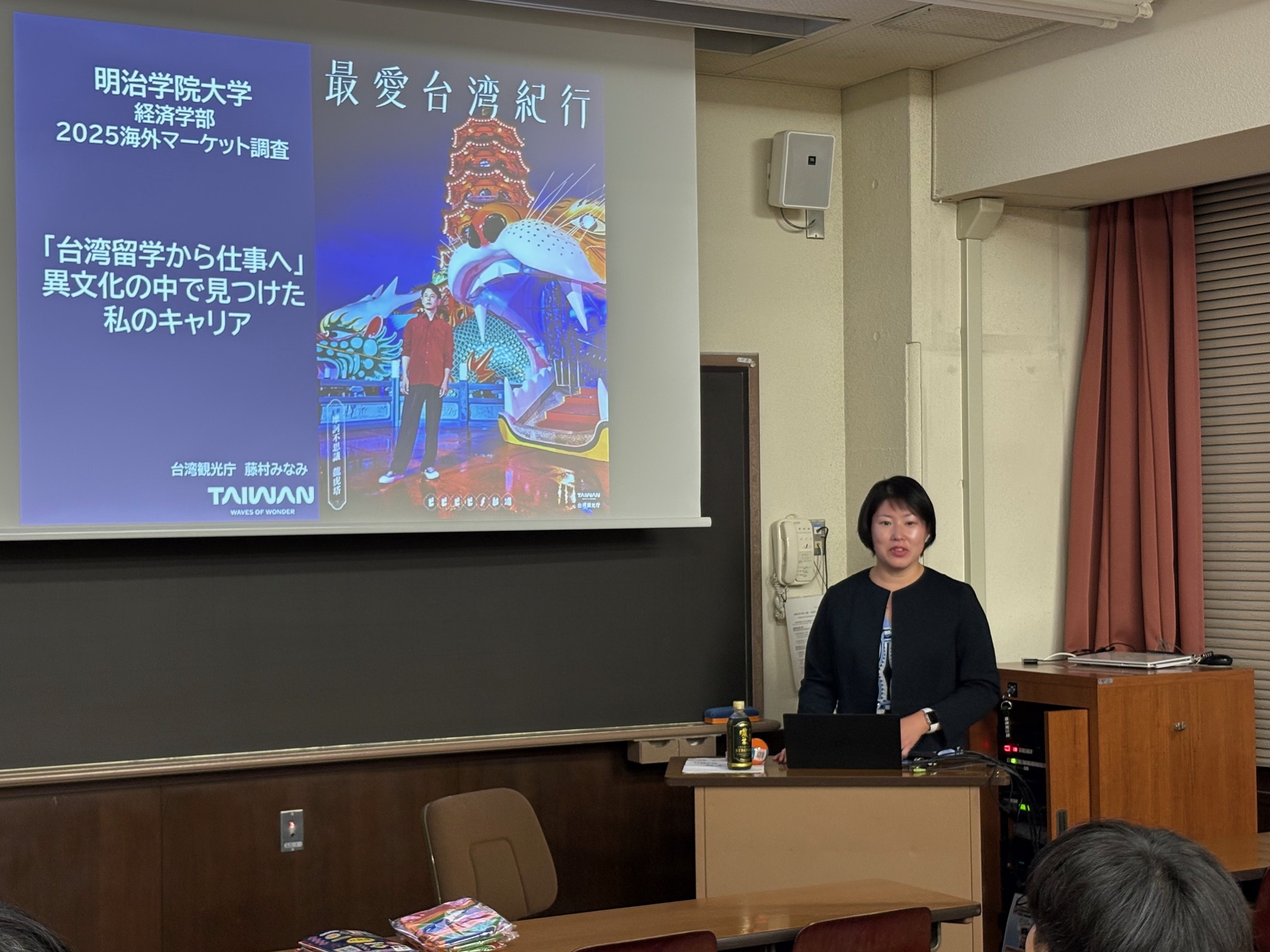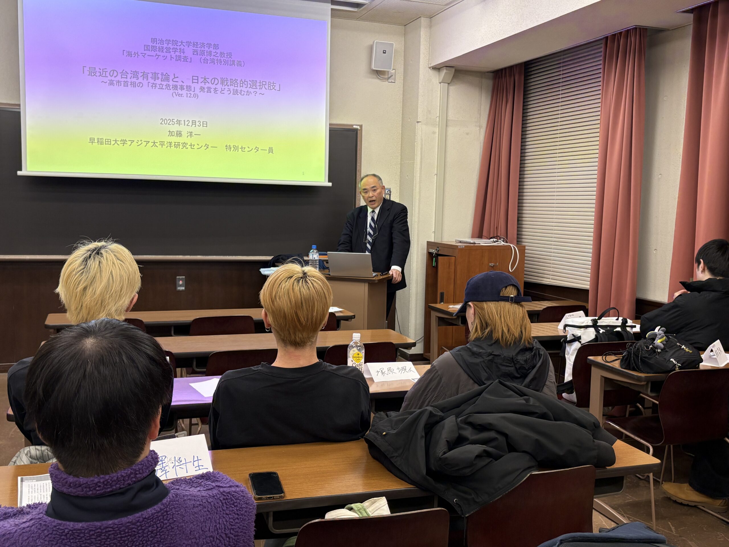 2025年度秋学期より、明治学院大学経済学部において「海外マーケット調査」の講義を開講しました。同講義の開講目的は、国際ビジネス、それを取り巻く環境も含め、それらの事情を理解することで、それぞれの分野に精通する講師を招いて講義を進めていきます。