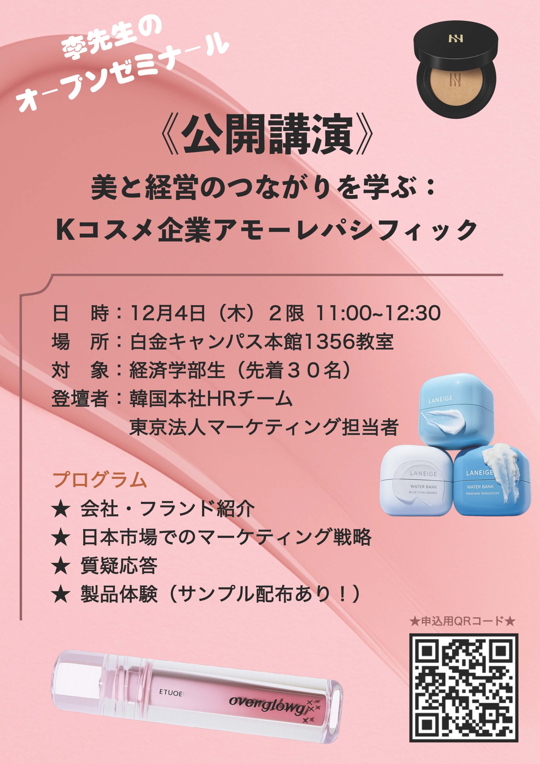 国際経営学科・李惠源先生のゼミナール活動の一環として、韓国を代表する化粧品企業「アモーレパシフィック」の本社HRチームおよび東京法人マーケティング担当者をお招きし、美容産業と経営戦略の関係について学ぶ公開講演を開催します。