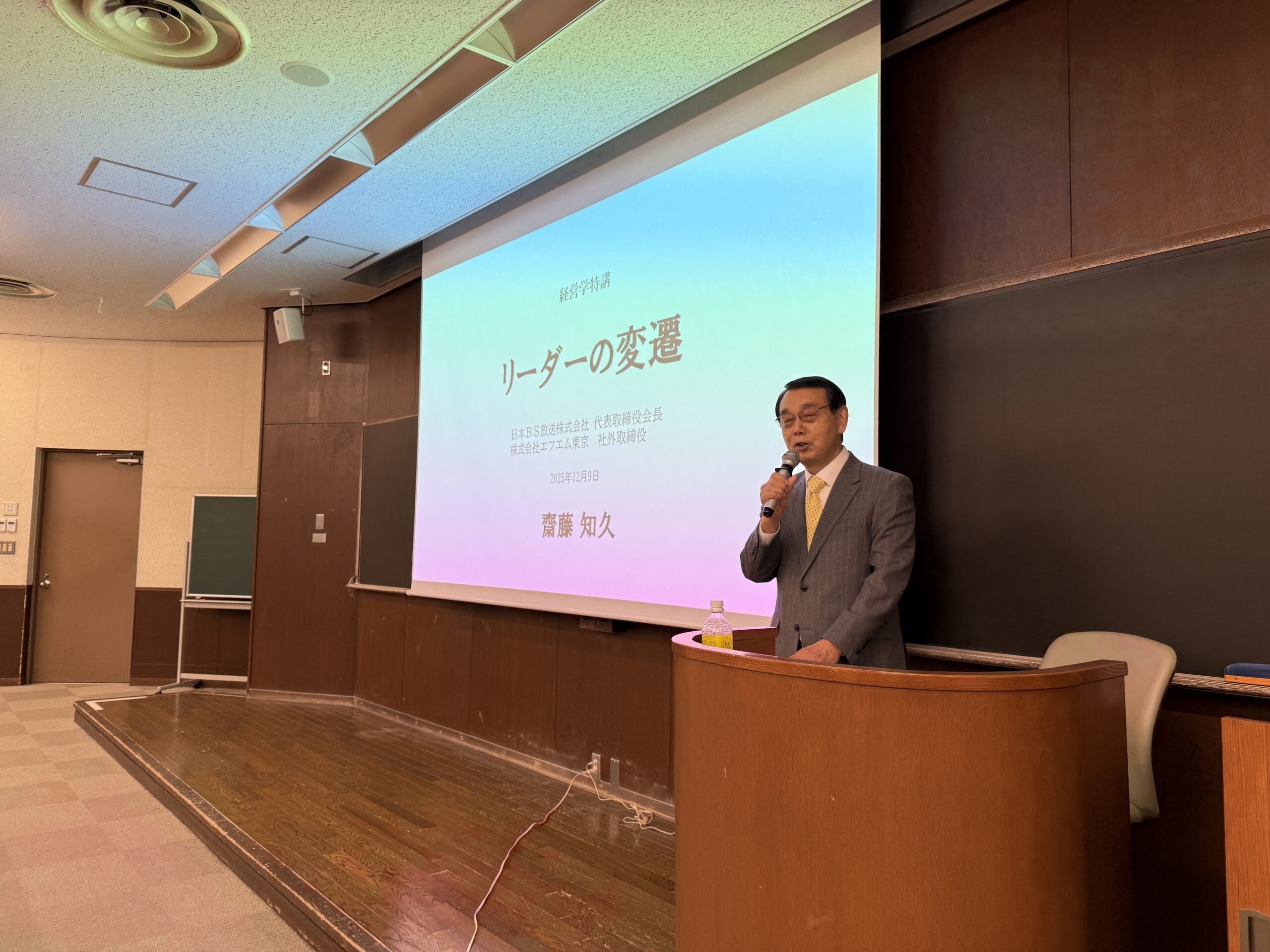 12月9日(火)、日本BS放送株式会社の代表取締役会長で株式会社エフエム東京の社外取締役をお務めになっている齋藤知久さんが、『リーダーの変遷』というテーマでお話しくださいました。まず、経営者がその時代のスポーツ界におけるリーダーの思想を経営へ応用している例として、大松博文監督と森保一監督をご紹介されました。大松監督は全面的に引っ張るティーチング型、森保監督はゴールを明確に示し、プロセスは選手に委ねるというコーチング型のリーダーシップを体現しています。これらの比較により、リーダーの在り方が時代とともに変化していることが示されました。また、現在はコーチング型が主流となっていますが、状況に応じてスタイル(支援型・委任型・コーチ型・指示型)を使い分ける「状況対応型リーダーシップ」も重要であることが説明されました。