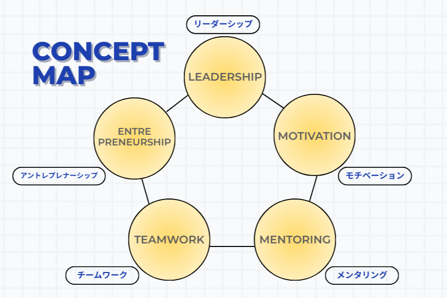 ELPでは、概念図のように、ハードスキルとソフトスキルの両面から、リーダーシップ・アントレプレナーシップを始めとして、モチベーション・メンタリング・チームワークなどについて、学びます。